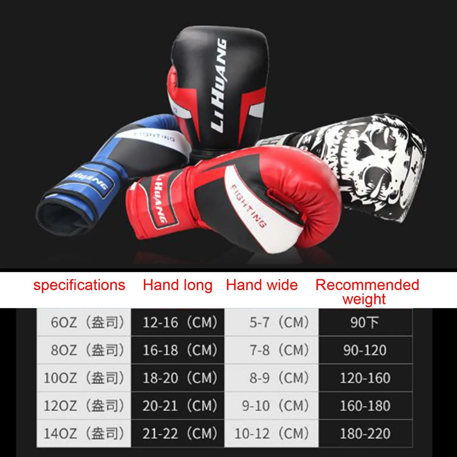 10oz: Length: 18-20cm/7.09-7.87 inch Width: 8-9cm/3.15-3.54 inch Recommended Weight: 60-80kg